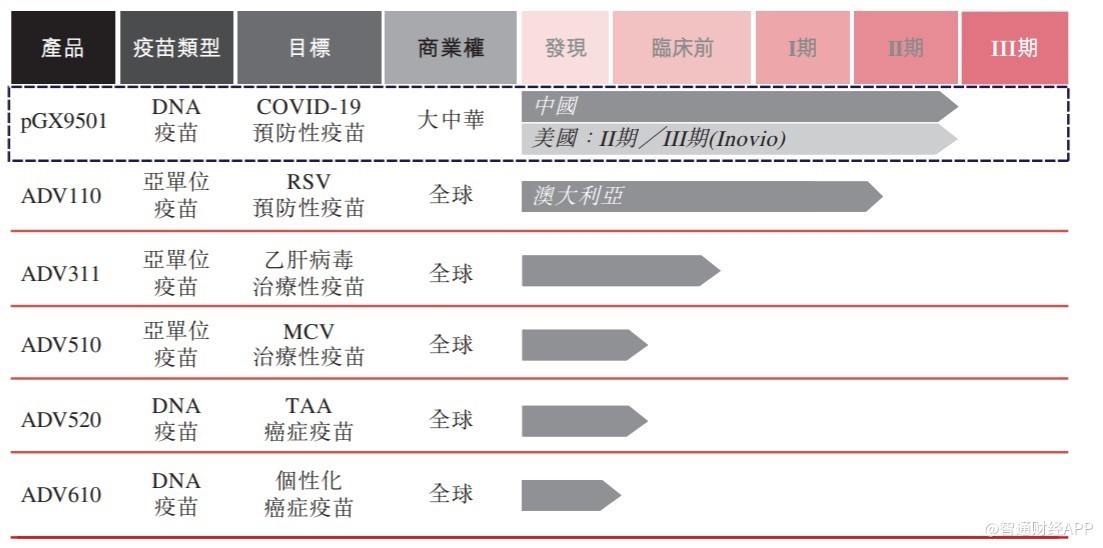 截至最后实际可行日期,公司正在为六个疾病领域开发六种候选疫苗,包括处于II期临床阶段的一种核心产品(pGX9501)、处于II期临床阶段的一种主要候选疫苗(ADV110)、处于临床前阶段的一种主要候选疫苗(ADV311)以及三种临床前阶段候选疫苗。公司的核心产品为新冠候选疫苗。除pGX9501为公司与美国Inovio公司(INO.US)共同开发外,公司的所有候选疫苗均为自行开发。