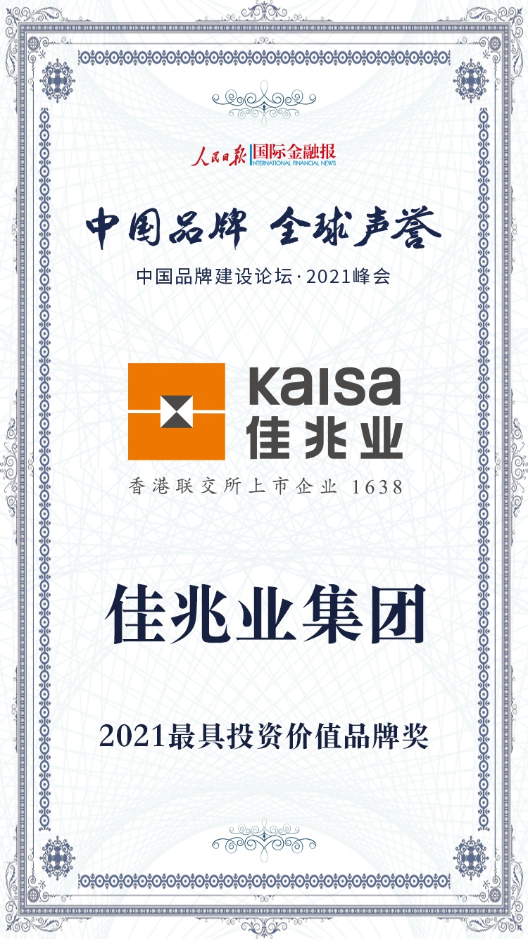 智通财经APP获悉,4月27日,由人民日报社《国际金融报》主办的“第三届中国品牌建设论坛·2021峰会”在上海举办,凭借不断提升的资本市场竞争力,佳兆业集团(01638)获评“2021最具投资价值品牌奖”。