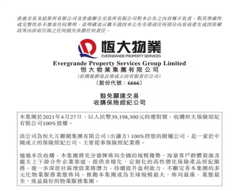 4月27日,恒大物业(06666)发布公告,全资收购恒大保险经纪有限公司。资料显示,恒大保险经纪是恒大集团旗下全资子公司,为用户提供涵盖人身险、财产险的综合性保险经纪服务,目前在全国拥有14家省级分公司和一支由近万名专业人员组成的销售和服务队伍,2020年保费业绩约9.5亿元。