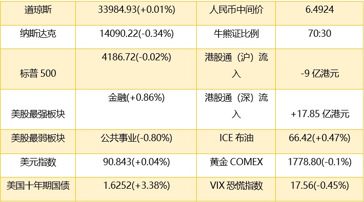 1、 美股收盘,道琼斯指数涨3.36点,涨幅0.01%,报33984.93点;标普500指数跌0.9点,跌幅0.02%,报4186.72点;纳斯达克综合指数跌48.56点,跌幅0.34%,报14090.22点。港股ADR指数上扬,按比例计算,收报29093点,涨152.26点或0.52%。