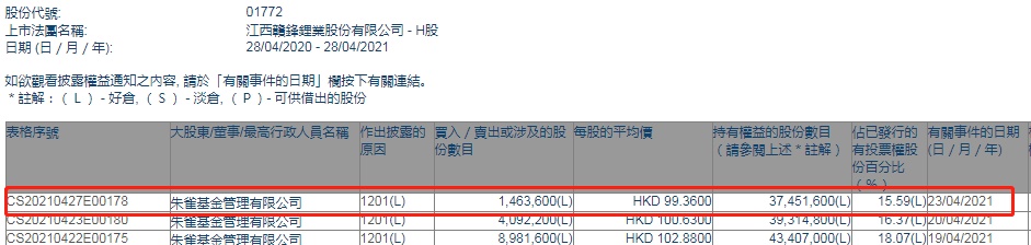 智通财经APP获悉,香港联交所最新资料显示,4月23日,朱雀基金减持赣锋锂业(01772)146.36万股,每股作价99.36港元,总金额约为1.45亿港元。减持后最新持股数目为3745.16万股,最新持股比例为15.59%。