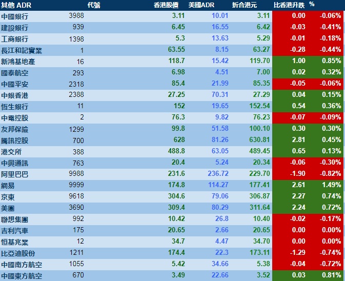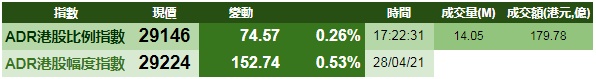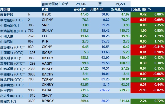 智通财经APP获悉,周三美股三大指数齐跌,港股ADR指数上扬,按比例计算,收报29146点,涨74.57点或0.26%。