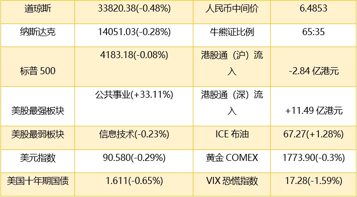 1、 美股收盘,道琼斯指数跌164.55点,跌幅0.48%,报33820.38点;标普500指数跌3.54点,跌幅0.08%,报4183.18点;纳斯达克综合指数跌39.19点,跌幅0.28%,报14051.03点。港股ADR指数上扬,按比例计算,收报29146点,涨74.57点或0.26%。