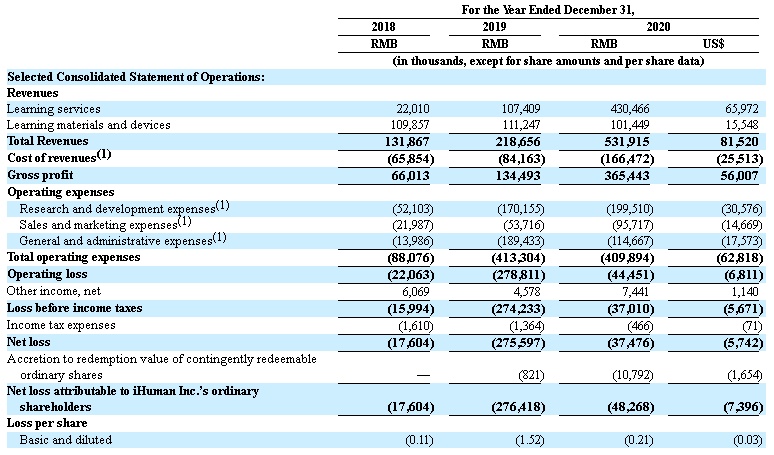 智通财经APP获悉,洪恩教育(IH.US)向美国SEC递交了20F报告,披露了公司截至2020年12月31日的2020年年报和最新股权结构。财报显示,该公司总营收为5.32亿元(人民币,下同),上年同期为2.19亿元。