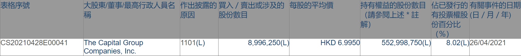 智通财经APP获悉,香港联交所最新资料显示,4月26日,美国资本集团增持中国财险(02328)899.625万股,每股作价6.9950港元,总金额约为6292.88万港元。增持后最新持股数目为5.53亿股,最新持股比例为8.02%。