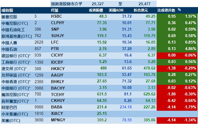 智通财经APP获悉,周四美股三大指数齐涨,港股ADR指数上扬,按比例计算,收报29327点,涨23.7点或0.08%。