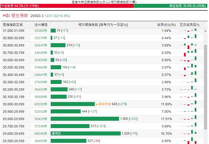 法兴恒指牛熊证街货分布图中的数据显示,熊证街货重货区在29600-29699区间,该区间最新熊证数量为1028张,较上一交易日增加76张;最多新增在30000-30099区间,该区间最新熊证数量为648张,较上一交易日增加279张。