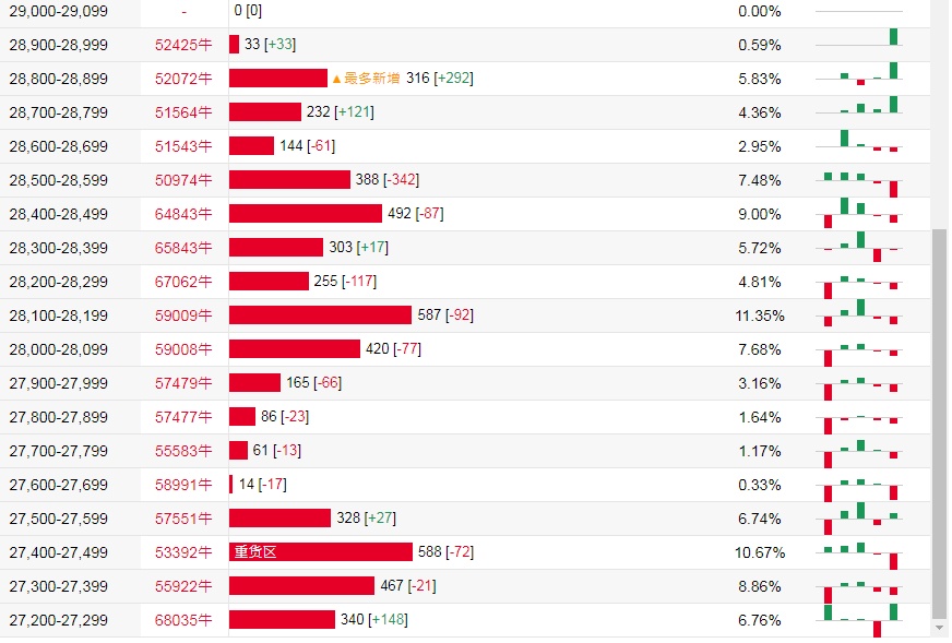 牛证街货重货区在27400-27499区间,该区间最新牛证数量为588张,较上一交易日减少72张;最多新增在28800-28899区间,该区间最新牛证数量为316张,较上一交易日增加292张。