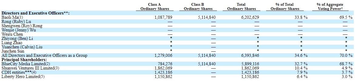 蓝城兄弟创始人、董事会主席兼首席执行官Baoli Ma持有公司33.8%的股权,投票权达69.5%。