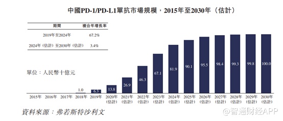 沙利文数据显示,2019年中国PD-1/PD-L1疗法的市场规模为63亿元,预期在2024年将达819亿元,至2030年达进一步增长至1000亿元,2019年至2024年复合年增长率为67.2%,2024年至2030年复合年增长率为3.4%。