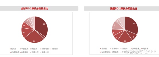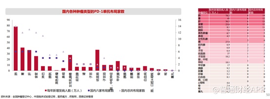 除了在研企业多以外,国内多数企业纷纷押注肺癌、胃癌、肝癌及食管癌这四大适应症,目前6家已获批上市的PD-1单抗厂家均有布局,并且每个适应症国内总共布局的家数都在10家以上,较为拥挤。预计在这些适应症上,未来的竞争格局将成为二八分化,销售实力较强、临床数据扎实的五六家厂家占据80%的市场份额。