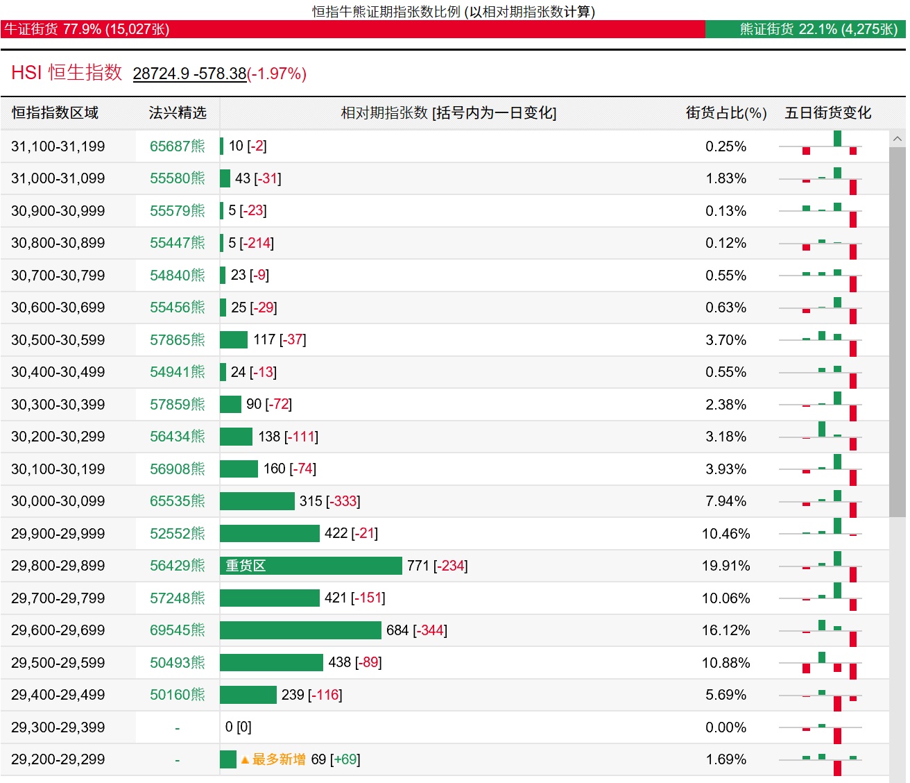 法兴恒指牛熊证街货分布图中的数据显示,熊证街货重货区在29800-29899区间,该区间最新熊证数量为771张,较上一交易日减少234张;最多新增在29200-29299区间,该区间最新熊证数量为69张,较上一交易日增加69张。