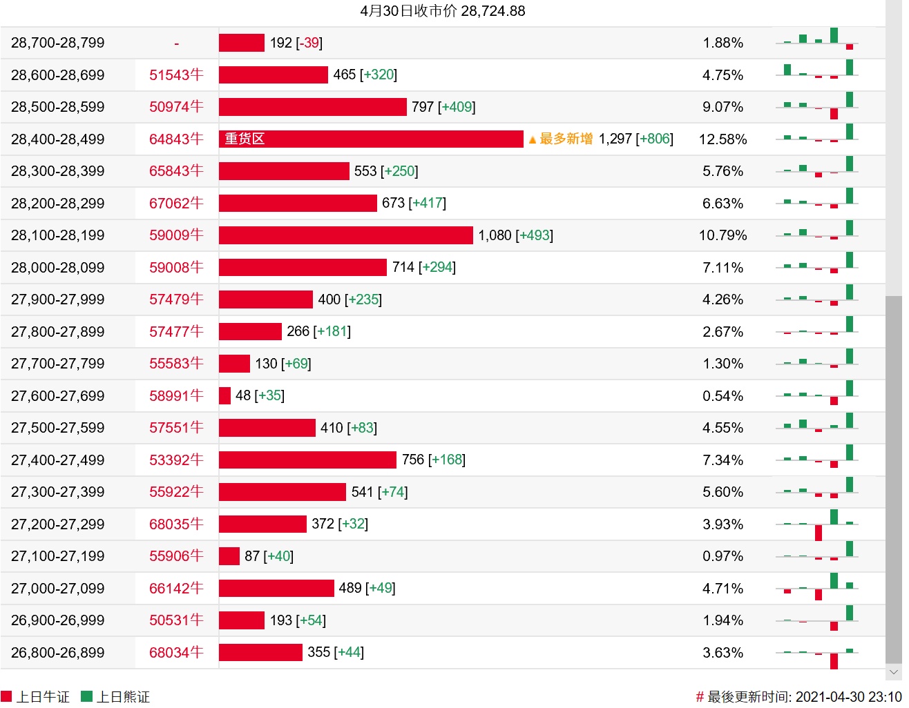 牛证街货重货区及最多新增都在28400-28499区间,该区间最新牛证数量为1297张,较上一交易日增加806张。