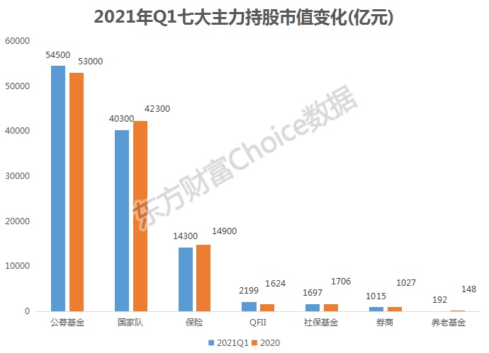 东方财富Choice数据显示,截至2021年一季度末,上述七大主力一季报合计持有A股市值11.42万亿元,比2020年年报的11.47万亿元减少了500亿元。