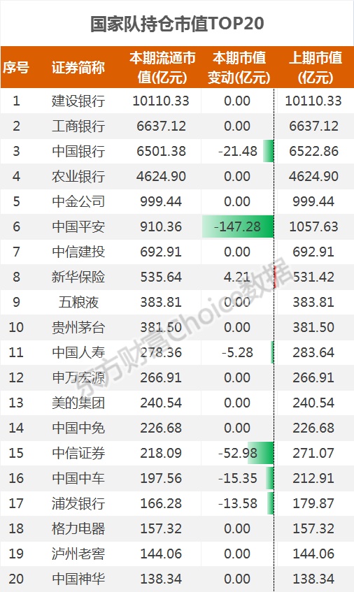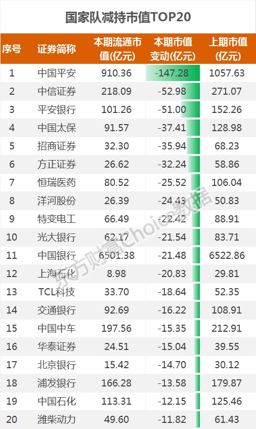 除中国平安、中信证券国家队分别减持147亿元和53亿元外,其余18只个股国家队持仓市值变化并不大。