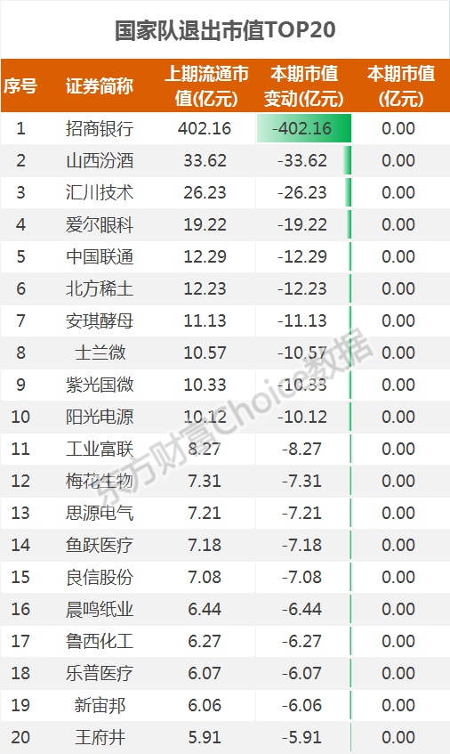 从一季度持股数据看,国家队退出了不少抱团白马股十大股东名单,其中去年年报持有招商银行(03968)402亿元,今年一季度消失在前10大流通股股东行列。