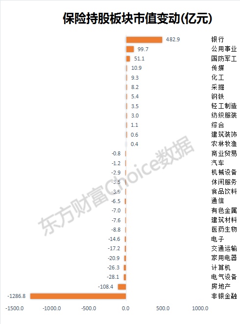 按申万一级行业看,2021年一季报,保险资金持有银行板块市值增加483亿元,减有非银金融板块市值减少1287亿元。