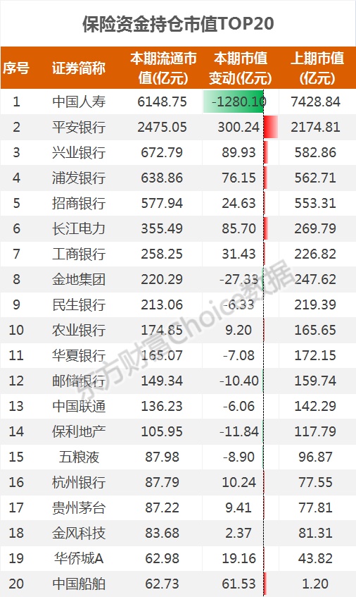 其中中国人寿市值减少1280亿元,平安银行市值增加300多亿元,此外兴业银行、长江电力、浦发银行、中国船舶等个股市值增加也均超60亿元。