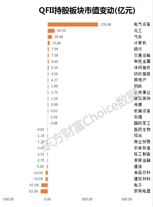 按申万一级行业看,2021年一季报,QFII持有流通市值增加最多的行业是电气设备、化工、汽车等行业。