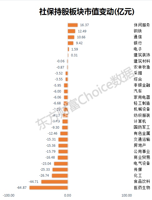 按申万一级行业看,2021年一季报,社保基金持有市值增加最多的板块是休闲服务、钢铁、通信等;持股市值减少最多的板块是医药、食品饮料、化工。