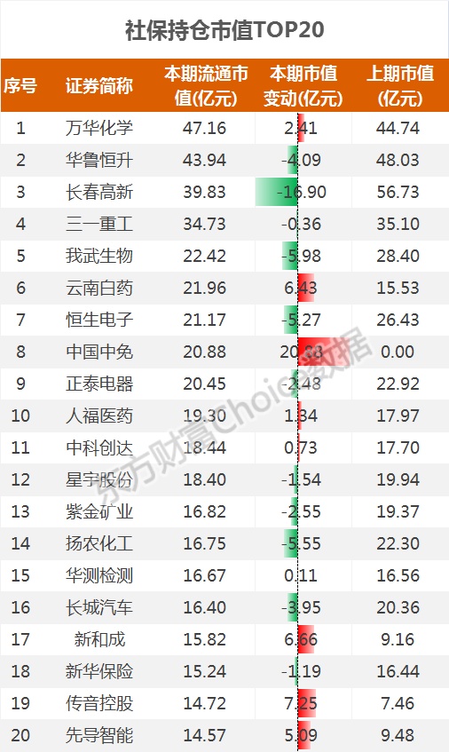 从持流通股市值角度来看,2021年一季报社保基金持有流通股市值最多的分别是万华化学、华鲁恒升、长春高新、三一重工等个股,持股市值均超30亿元。