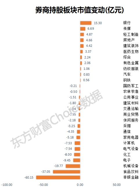 按申万一级行业看,2021年一季度券商持流通股市值增加最多的板块分别是银行、传媒等;持股市值减少最多的板块分别是非银金融、食品饮料。