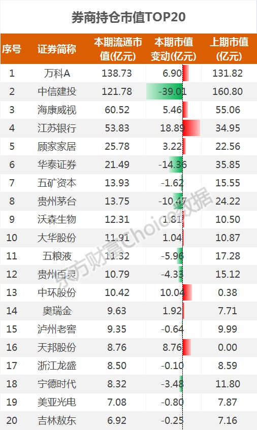 从持流通股市值角度来看,2021年一季度券商持有流通股市值最多的为万科A、中信建投、海康威视、江苏银行等个股,其中万科A持股市值为138亿元,较2020年年报增加了7亿元。