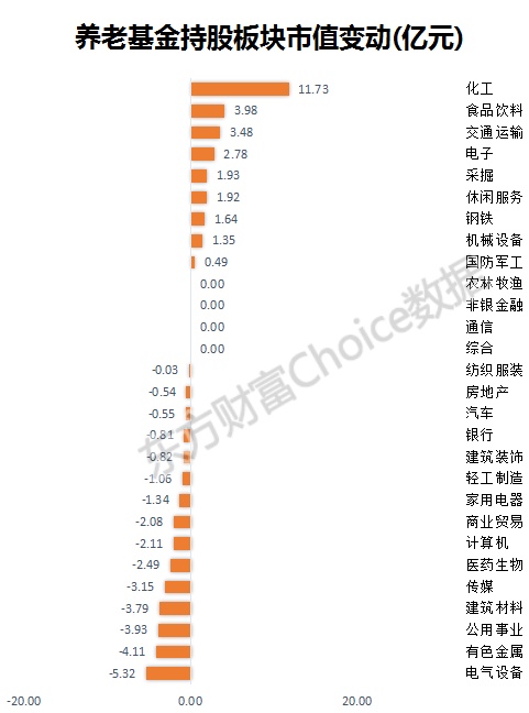 按申万一级行业看,2021年一季度养老基金持流通股市值增加最多的是化工、食品、交通运输等板块;持流通股市值减少最多的是电气设备、有色金属、公用事业等板块。