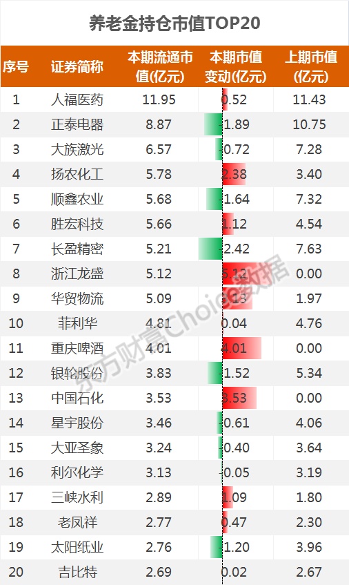 从持流通股市值角度看,2021年一季度养老基金持流通股市值最多的是人福医药、正泰电器、大族激光、扬农化工等个股,其中人福医药持有12亿元。