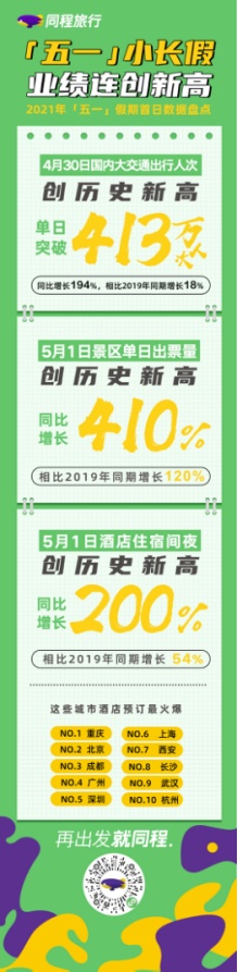 随着备受瞩目的五一小长假开启,中国旅游市场迎来出行高峰。同程旅行大数据显示:4月30日至5月1日,同程旅行大交通服务人次、酒店预订间夜量、景区单日出票量均已超过疫情前,并突破历史新高。同程旅行提醒广大消费者,虽然国内疫情得到有效控制,但消费者出行仍需注意科学防疫,建议有条件的消费者选择错峰出行。