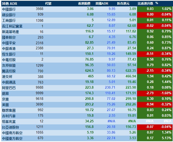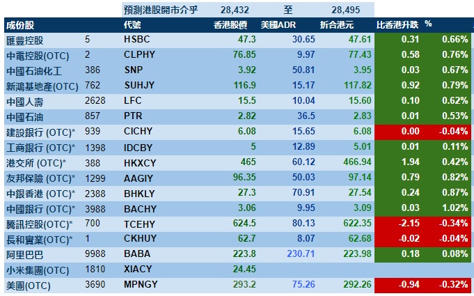 智通财经APP获悉,隔夜美股三大指数涨跌不一,港股ADR指数小幅上扬,按比例计算,收报28432点,涨74.7点或0.26%。
