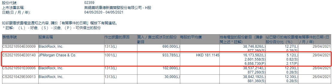 智通财经APP获悉,香港联交所最新资料显示,4月29日,摩根大通增持药明康德(02359)93.3785万股,每股作价181.1145港元,总金额约为1.69亿港元。增持后最新持股数目约为1617.36万股,最新持股比例为5.12%。