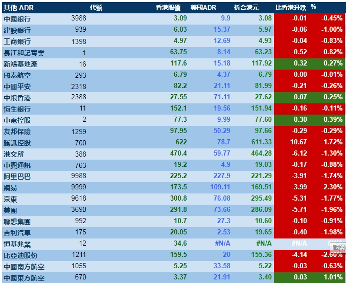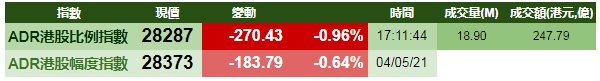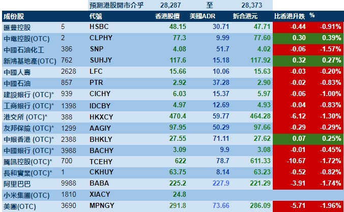 智通财经APP获悉,周二美股三大指数涨跌不一,港股ADR指数下挫,按比例计算,收报28287点,跌270.43点或0.96%。