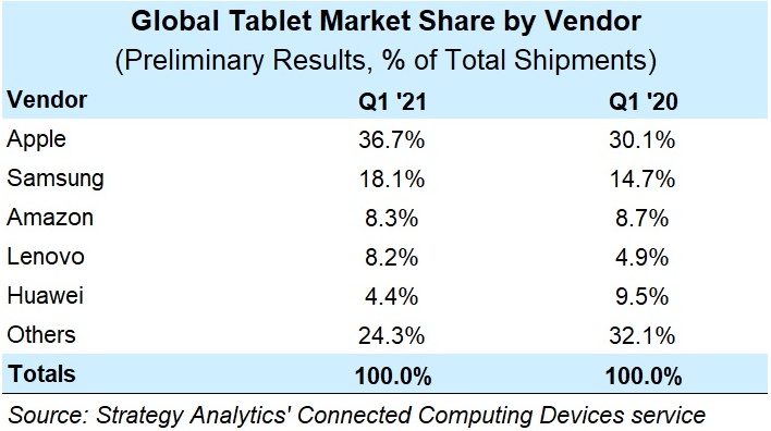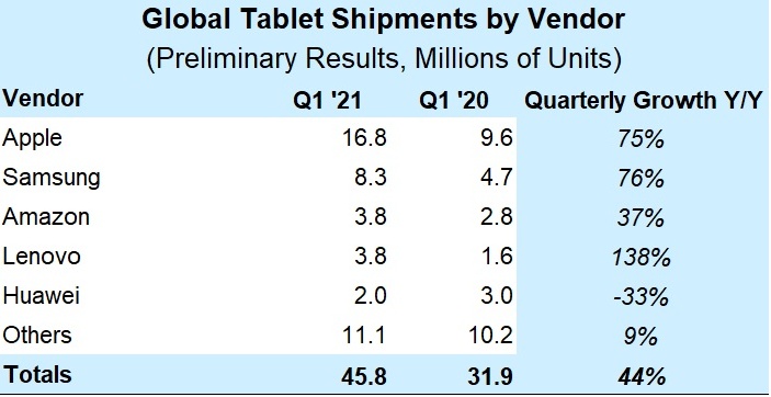 据智通财经APP获悉,数据显示,苹果(AAPL.US)、三星、联想(00992)和亚马逊(AMZN.US)的平板电脑2021年Q1业绩都表现除了较为强劲的增长势头,这得益于疫情期间人们居家隔离而对平板电脑的需求增加。其中,三星和苹果公司平板电脑出货量分别为1680万台、830万台,同比增长76%和75%;而联想出货量为380万台,同比增长138%,连续二季度出货量倍增。而华为2021年Q1表现相比之下较为悲观,出货量为2百万台,同比下降33%。