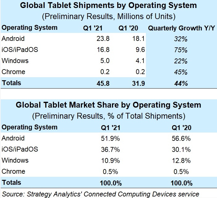 苹果上季度表现得非常强劲,但三星,联想和亚马逊这些Android竞争对手表现也较为亮眼。平板电脑市场份额按操作系统划分,iOS/iPadOS系统2021年季度增长率高达75%,但安卓系统仍占市场份额超一半达51.9%。