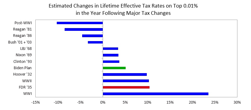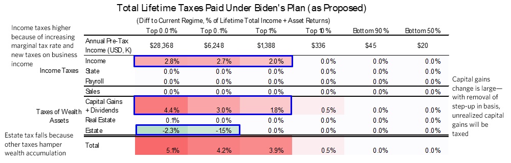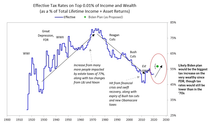 如果没有特别的努力逃税,拜登税收方案(如提议的那样)可能是自罗斯福以来对富人最大的一次增税。我们做了一个模拟人们一生将面临的税收的练习。虽然这个模拟精确性不高,但我们粗略估计,拜登的计划,如提议的那样,将意味着大约4-6%的税率提高或10%左右的税后终生收入(包括定期收入和资产回报率)下降。这在我们之前展示的图表中有所体现。