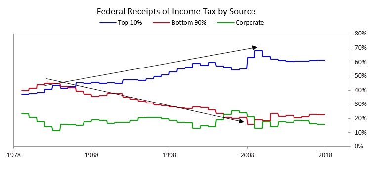 重要的是,尽管最高收入家庭的总税率随着时间的推移一直在下降,但他们的总税收份额(联邦政府从家庭获得的所得税的百分比)却在增加。这在很大程度上是财富和收入向上层集中的结果。下表列出了政府按前10%、最底层90%和企业所得税征收的所得税。