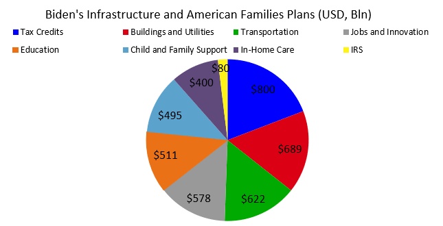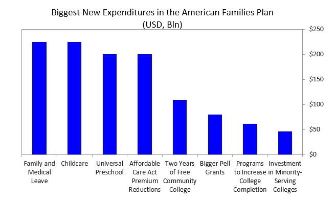新的税收正被用于资助许多新的社会项目、税收抵免、政府服务的扩展等。乍一看,它们给我们的印象是对基础设施、教育和社会安全网的扩展的明智投资。然而,我们必须更仔细地研究这些项目,以找出它们通过提高生产率来做大蛋糕大小的效果,以及它们分蛋糕的效果。这张图表显示了拜登基础设施和美国家庭计划中的新支出领域(使用《纽约时报》的支出领域分类)。