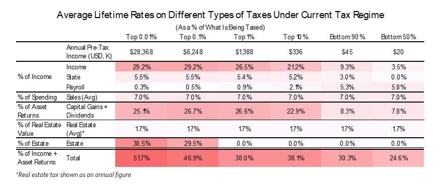 为了更加贴切的进行税率的对比,下表展示了现行税法下,我们根据不同收入分位数划分的个人一生中所有收入(收入加上资产回报)的税收统计对比。我们可以看到,居民一生中全部收入中各分项税费对整体税赋的贡献度。