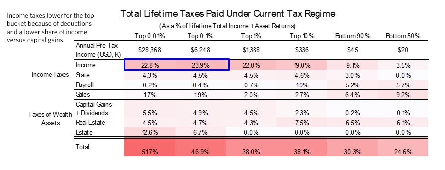 我们将从现行的税法切入(在经过拜登修改税法以前)。下表,展示根据财富和收入分位数划分的税收档次。第一个表显示了在现行税法下的平均“有效税率”,即人们通常认为的所得税占收入的百分比,销售税占支出的百分比,等等。