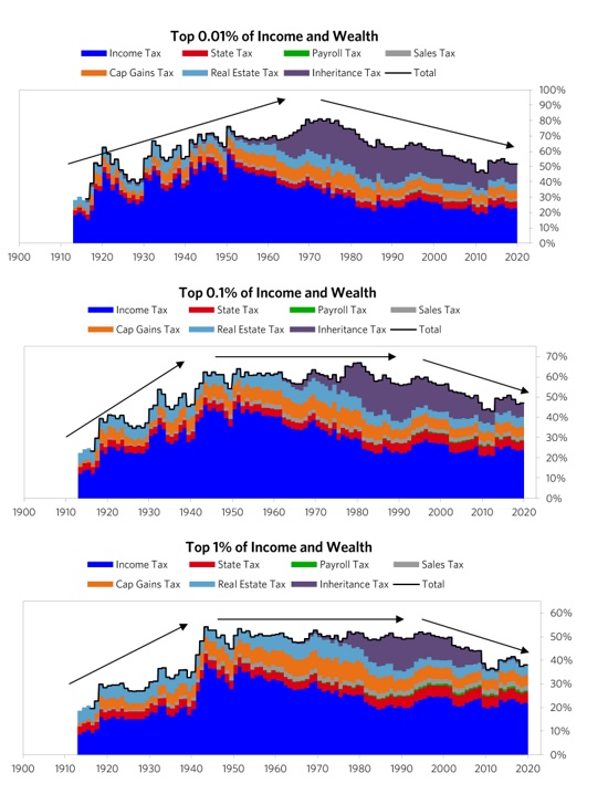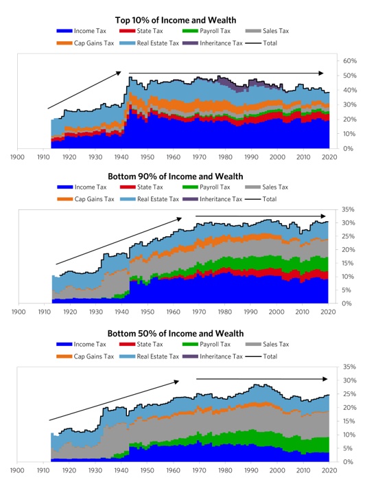 同时,我们在税收负担上看到的最后一个重大变化是从大萧条到大约1950或1960年。税负的增加由各财富与收入阶层的家庭广泛支付,部分原因是需要钱来填补第二次世界大战的高税收负担。在这段时间里,税收政策发生了几项重大变化: