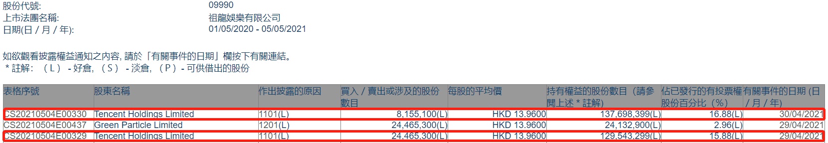 智通财经APP获悉,香港联交所最新资料显示,4月29日、4月30日,腾讯控股(00700)分别增持祖龙娱乐(09990)2446.53万、815.51万股,两日合计增持3262.04万股,每股作价均为13.96港元,总金额约为4.55亿港元。增持后最新持股数目约为1.38亿股,最新持股比例为16.88%。