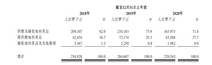 因选择地材的市场趋势不断演化,来自向英特飞采购的地材产品的收益由截至2019年12月31日止年度的人民币244.2百万元下降至截至2020年12月31日止年度的人民币175.3百万元。公司董事指出,市场及设计趋势正朝着一个项目混合使用不同类型地材产品发展。除方块地毯外,LVT、PVC、橡胶及弹性地材产品的需求不断增加。公司将会增加其他供应商采购的品类,以扩大向客户提供的产品组合。 预期截至2021年12月31日止年度,英特飞应占的收益及毛利百分比分别约为81.8%及39.9%。