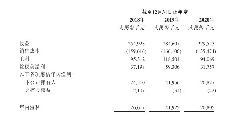 从财务数据上来看,2018-20年度,公司收益分别为2.55亿、2.85亿、2.30亿元(同比减少19.3%),毛利分别为9531万、1.19亿、9407万(同比减少21.0%),年内溢利分别为2662万、4193万、2081万人民币(同比下滑50.3%)。