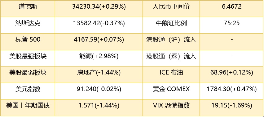 1、 隔夜美股截至收盘,道琼斯指数涨97.31点,涨幅0.29%,报34230.34点,盘中再创新高,收盘也创新高;标普500指数涨2.93点,涨幅0.07%,报4167.59点;纳斯达克综合指数跌51.08点,跌幅0.37%,报13582.42点。港股ADR指数上扬,按比例计算,收报28498点,涨81.05点或0.28%。