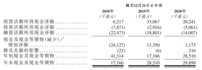 另外,现金流水平上则也处于比较波动增长状态:2018年至2020年,博维智慧科技的经营活动所得现金净额分别为622万港元、3307万港元、2024万港元;同期现金及现金等价物则分别为1717万港元、2852万港元、2990万港元。