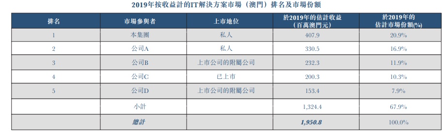 据智通财经APP了解,澳门的IT解决方案市场于2019年约有200名市场参与者。另外,澳门的IT解决方案市场相对集中,按收益计,五大参与者占整个市场约67.9%。本集团就提供IT解决方 案录得收益约407.9百万澳门元,占澳门市场份额约20.9%。