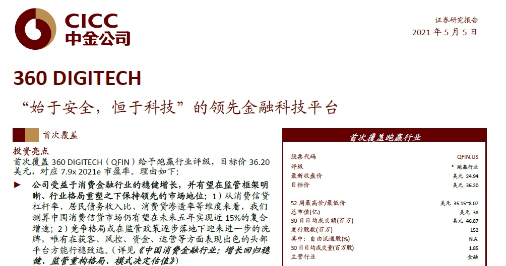 智通财经APP获悉,5月5日,中金发布首次覆盖360数科(QFIN.US)报告,给予跑赢行业评级,目标价36.20美元。报告指出,360数科受益于消费金融行业的稳健增长,有望在监管框架明晰、行业格局重塑之下保持领先的市场地位。中金看好公司,认为360数科通过优异的经营效率、夯实的风控水准、适应潜在监管变化的能力,能够在行业洗牌中脱颖而出。其关联方360集团旗下银行牌照等资源有助于公司未来新业务的拓展。