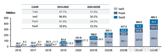 在国内,PaaS领域整体规模约237亿元(人民币,下同),从2016年到2020年的复合年增长率为61.9%。由于业务需求仍在增加、尖端云技术的不断创新以及有利的政策支持,预计2025年将达到1023亿元。
