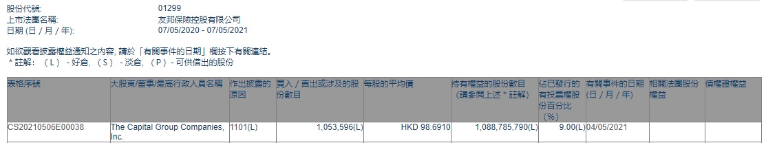 智通财经APP获悉,香港联交所最新资料显示,5月4日,美国资本集团增持友邦保险(01299)105.3596万股,每股作价98.691港元,总金额约为1.04亿港元。增持后最新持股数目约为10.89亿股,最新持股比例为9%。